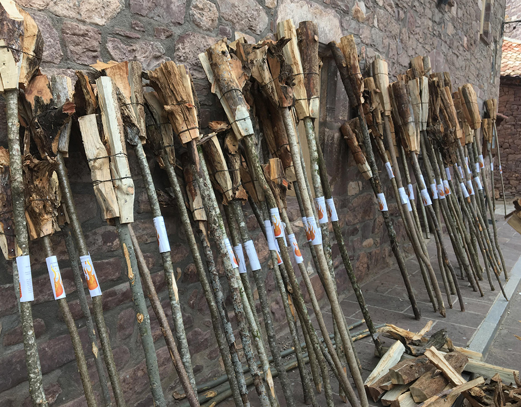 El encendido de la hoguera en un tozal, punto alto sobre la población, deriva en la bajada al núcleo de casas en un camino iluminado por las fallas hechas anteriormente por cada casa en una tradición heredada de padre a hijos, de abuelos a nietos.